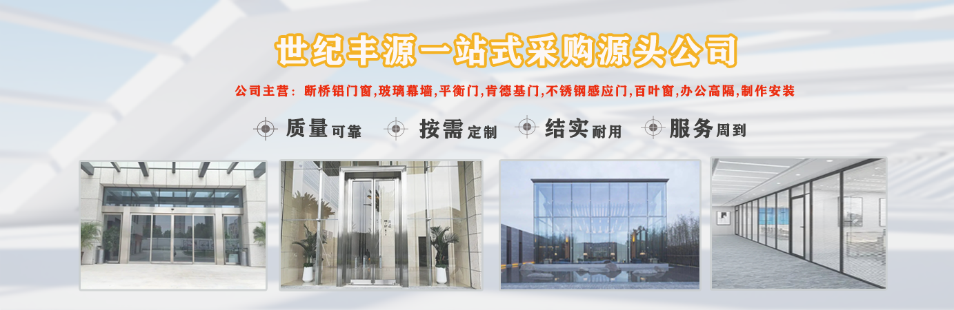 天津世紀豐源門窗有限公司從事斷橋鋁門窗,玻璃幕墻,平衡門,肯德基門,不銹鋼感應門,百葉窗,辦公高隔,制作安裝一站式訂制生產及配套服務等?! 」咀猿闪⒁詠恚冀K堅持以人才為本、誠信立業的經營原則,薈萃業界精英,成熟的技術、管理方法及企業經驗與國內企業的具體實際相結合,為企業供給各個方面的解決方案,使企業在激烈的市場競爭中始終堅持競爭力,實現企業快速、穩定地發展。  質量好、服務好、才能信譽好,公司已在諸多領域取得輝煌成績,愿意成為您可信賴的長期合作伙伴。  讓我們攜手同行,共同實現“讓普通老百姓都用得上高端門窗”...
